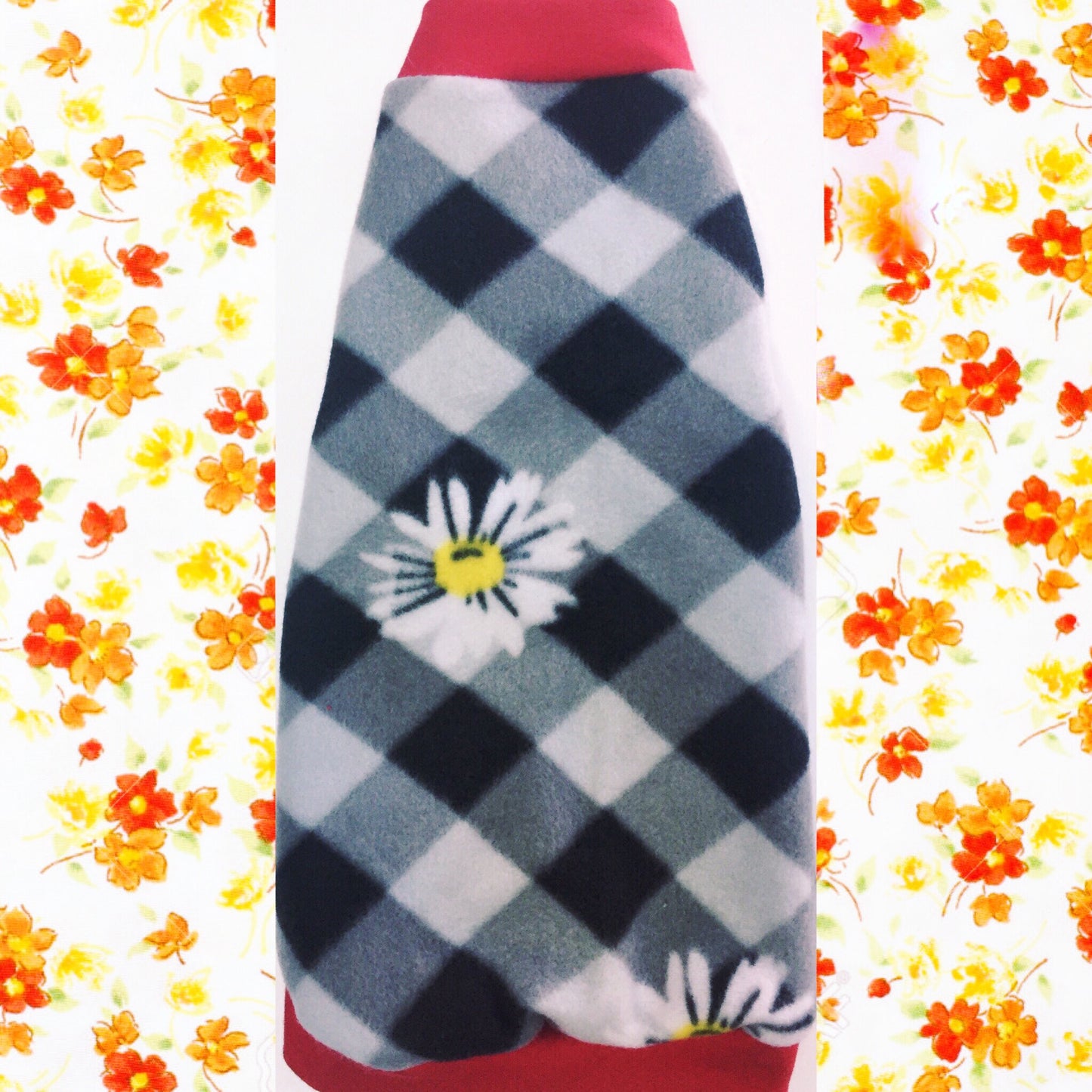 Remember fleece run smaller than knits so if your kitty is at the top of a size--order the next size up!  If you have questions, please use the live chat or email us before you order!