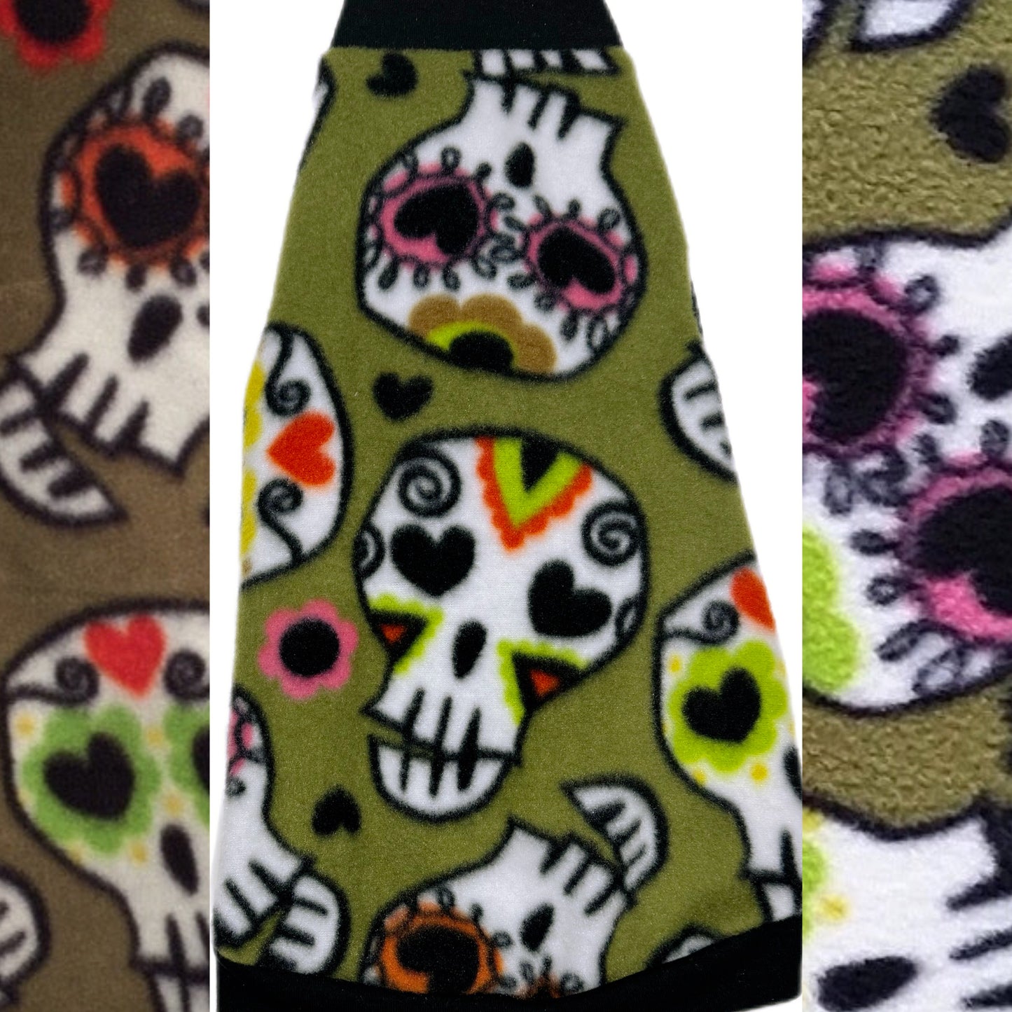 Remember fleece run smaller than knits so if your kitty is at the top of a size--order the next size up!  If you have questions, please use the live chat or email us before you order!