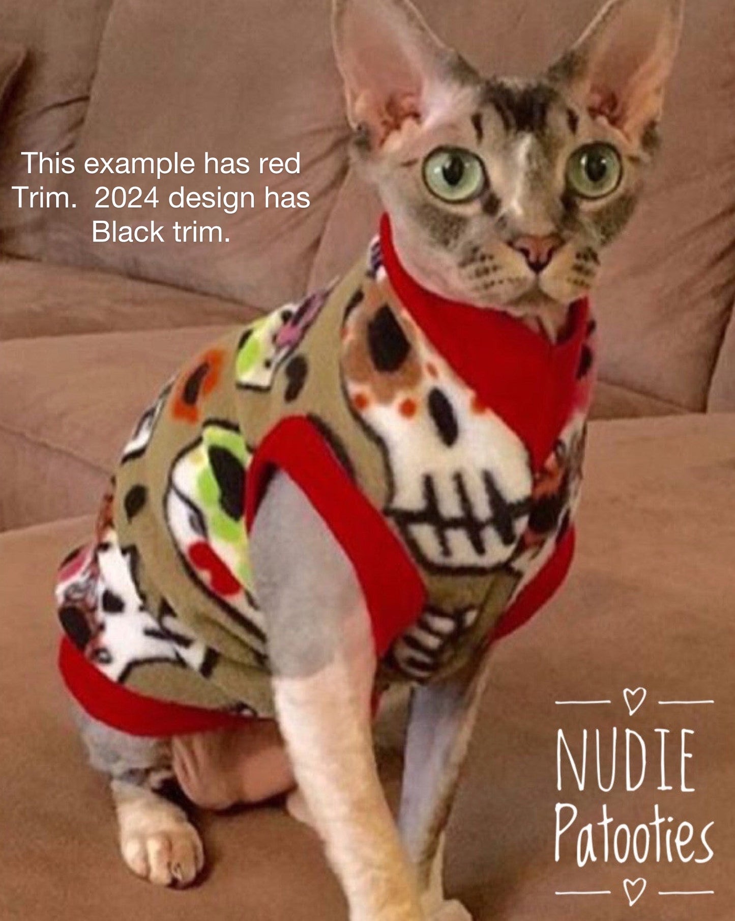 Nudie Patooties Fleece shirt for your sphynx cat, sphynx kitten, cornish rex, peterbald and devon rex cat.  Sphynx cat clothes, shirts and sweaters.