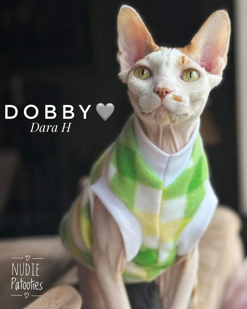Nudie Patooties soft and warm fleece shirt for your sphynx cat, sphynx kitten, cornish rex, peterbald and devon rex cat. Sphynx cat clothes, shirts and sweaters.