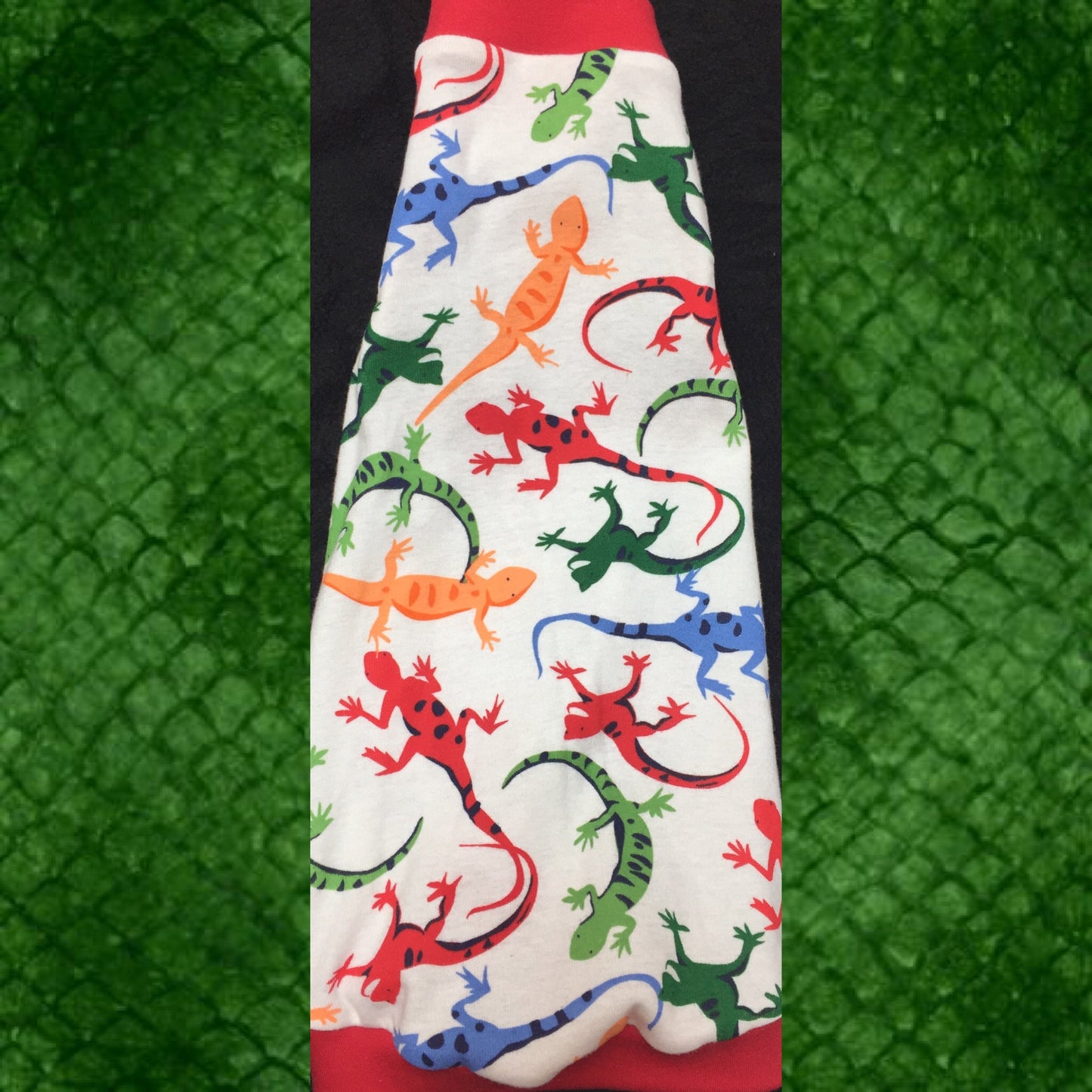 Adorable lizards in bright colors! This is a light weight, 100% cotton knit fabric! Purrfect for mild weather!